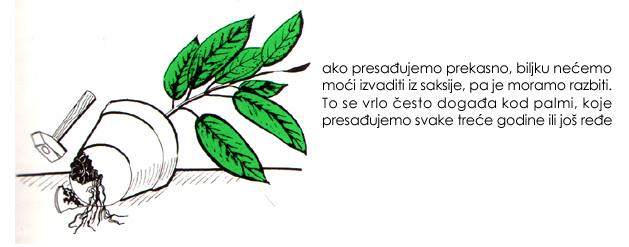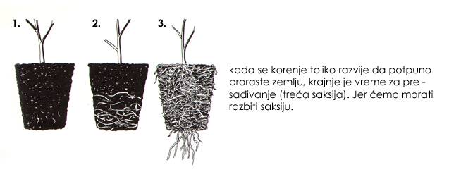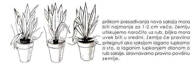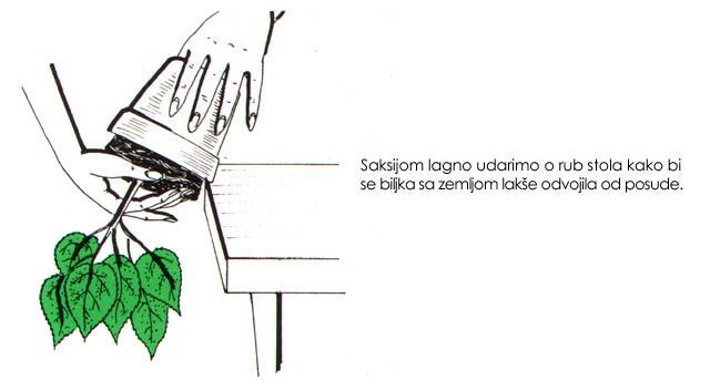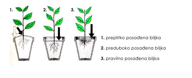 Saksiju napunimo zemljom nešto niže od ruba i posadimo sadnicu. Zemlju pritisnemo prema korenju prstima ruke, zatim lagano lupnemo saksijom o sto, pa će se zemlja slegnuti. Tako se uz rub saksije stvori žljeb za zalivanje.Ukoiko je zemlja dovoljno vlažna, ne moramo biljku odmah zaliti.